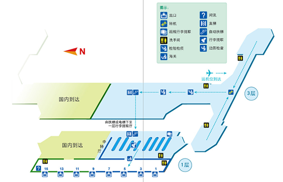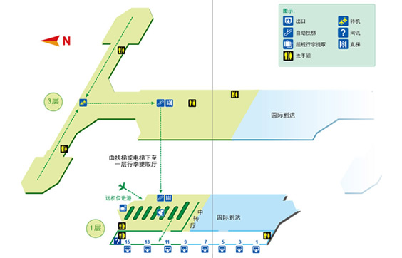 行李提取廳位于二層,其入口處設有行李轉盤顯示屏,您可根據航班號查知您的托運行李所在的轉盤。有關行李問題,請向航空公司查詢。