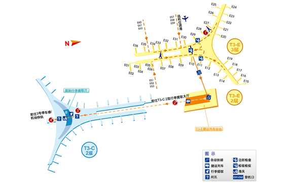 T3-D國內到達旅客可采用擺渡車/APM通行。
