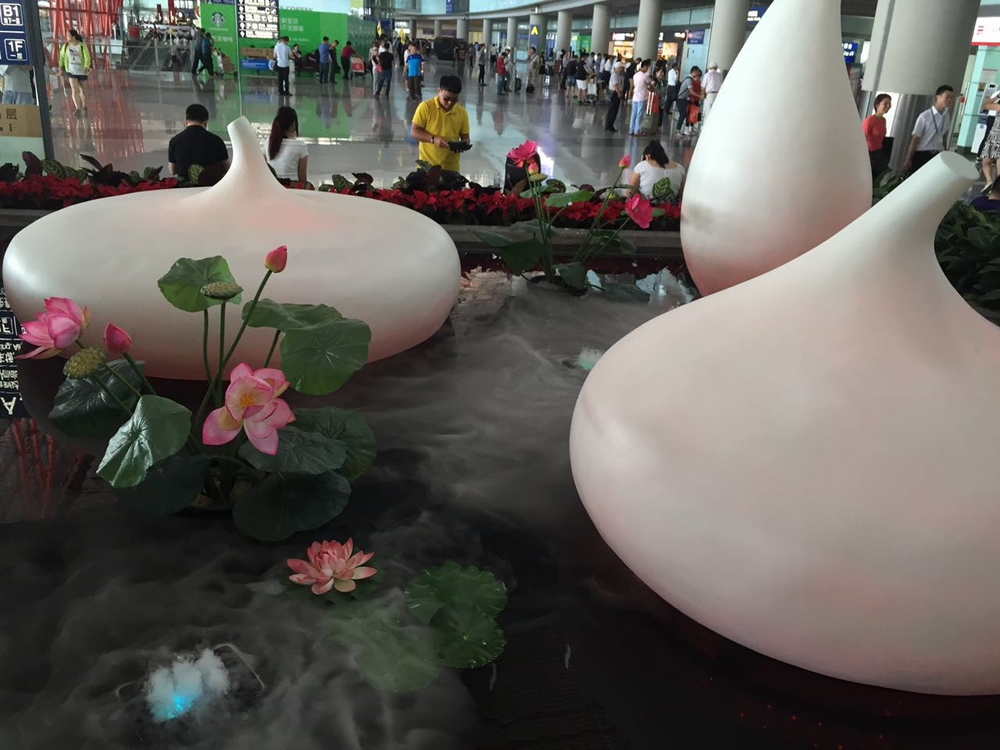 T3C二層進(jìn)港東西兩側(cè)各有一處清新舒適且現(xiàn)代美觀的“小綠洲”景觀。由“水滴”提煉出來(lái)的造型,現(xiàn)代而簡(jiǎn)約,形態(tài)優(yōu)美,象征著清新自然、生生不息的美好寓意。東邊名為《曲苑風(fēng)荷》,以水滴造型設(shè)計(jì)的小品配合流水,通過(guò)燈光和色彩的處理,使小品如同身姿曼妙的舞者,美輪美奐。西邊名為《高山流水》,以秀竹為背景,將小品和流水形象地表現(xiàn)為潺潺流水和巍巍高山相映成趣的意境,仿佛山巒起伏的遠(yuǎn)景就呈現(xiàn)在面前。
