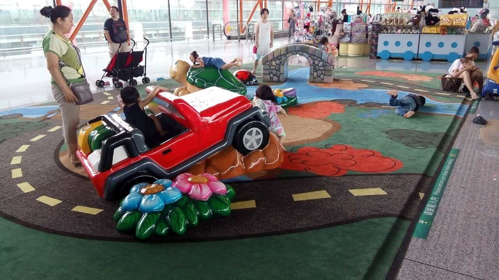 C09登機口兒童活動區是以汽車為主題的活動區域,區域內卡通汽車、海龜分布錯落有致,地毯上繪有卡通跑道圖案,整體風格活潑、主題性突出。