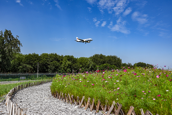 首都機(jī)場(chǎng)西跑道北端由北部土坡區(qū)、南部平整區(qū)以及排水明溝等區(qū)域構(gòu)成,總面積約3.3萬平方米。該區(qū)域原為渣土堆,堆放了較多建筑垃圾,容易吸引鳥類停留,環(huán)境治理難度較大。面臨種種挑戰(zhàn),首都機(jī)場(chǎng)飛行區(qū)管理部積極創(chuàng)新工作思路,以人工種植的草坪為基底,選擇4種—5種適合北方地區(qū)生長且不吸引鳥類的草種整體分區(qū)種植,并搭配種植小面積波斯菊,在西跑道北端打造了一片花海。