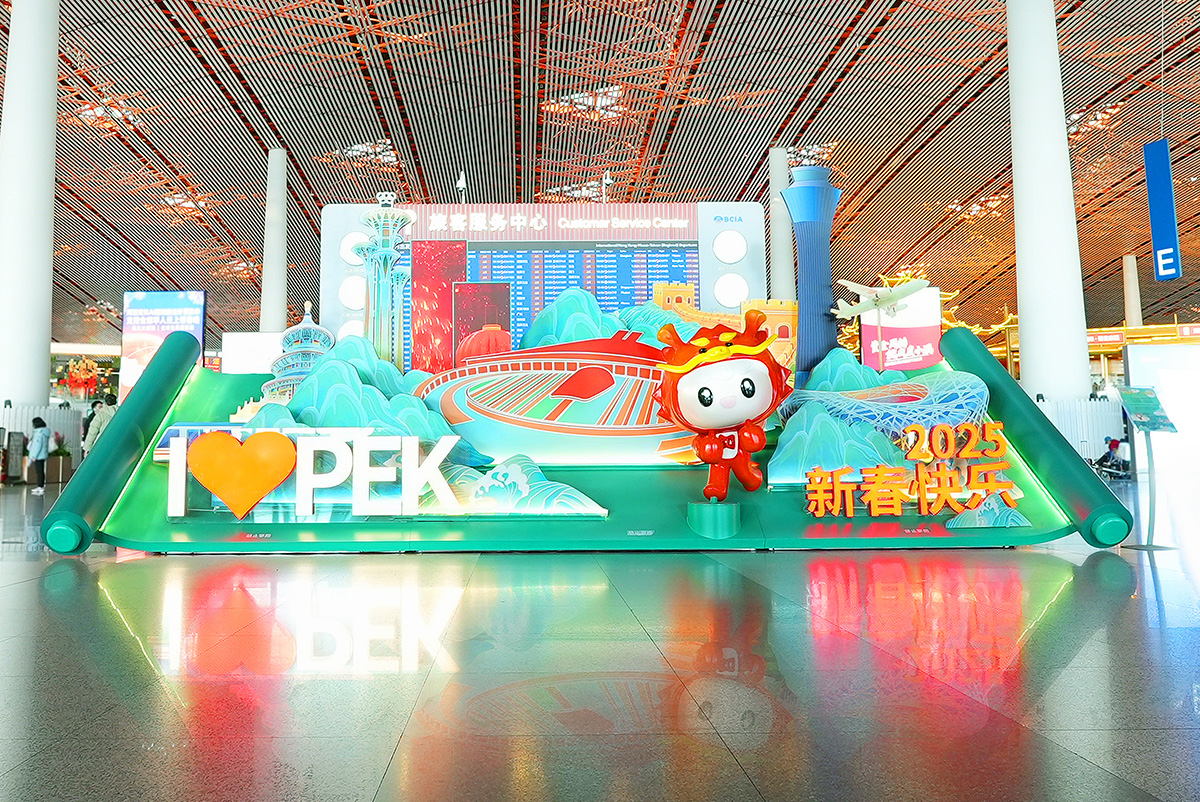 春運(yùn)期間,首都機(jī)場上新樓內(nèi)景觀,為往來旅客呈現(xiàn)了一場別開生面的視覺盛宴。在3號航站樓內(nèi),一幅絢麗的新春畫卷徐徐展開。以綠色卷軸打底,景觀巧妙地融入北京標(biāo)志性建筑,俏皮可愛的首都機(jī)場服務(wù)品牌IP“都都”和“新春快樂”4個大字仿佛在向每一位旅客熱情地打招呼,傳遞最真摯的新春祝福,讓旅客感受到新春的喜悅。